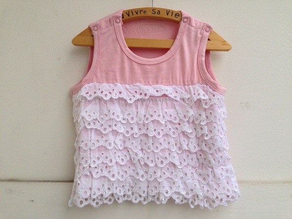 小さなラメが入ったカットソー生地に、コットンレースをたくさん重ねたタンクトップ。