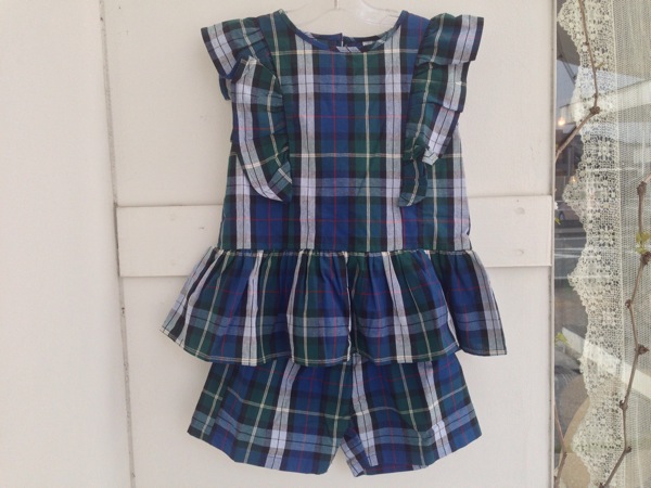 肩のフリルがかわいい、ノースリーブとショートパンツのセットアップ。 トップスだけでも、インナーサロペットのみでも着用できる、3way仕様です。 トラッドなチェック柄もかわいいポイントです‼︎*magic 3way setup size:100〜150 color:ck-green price:¥6,600+tax〜